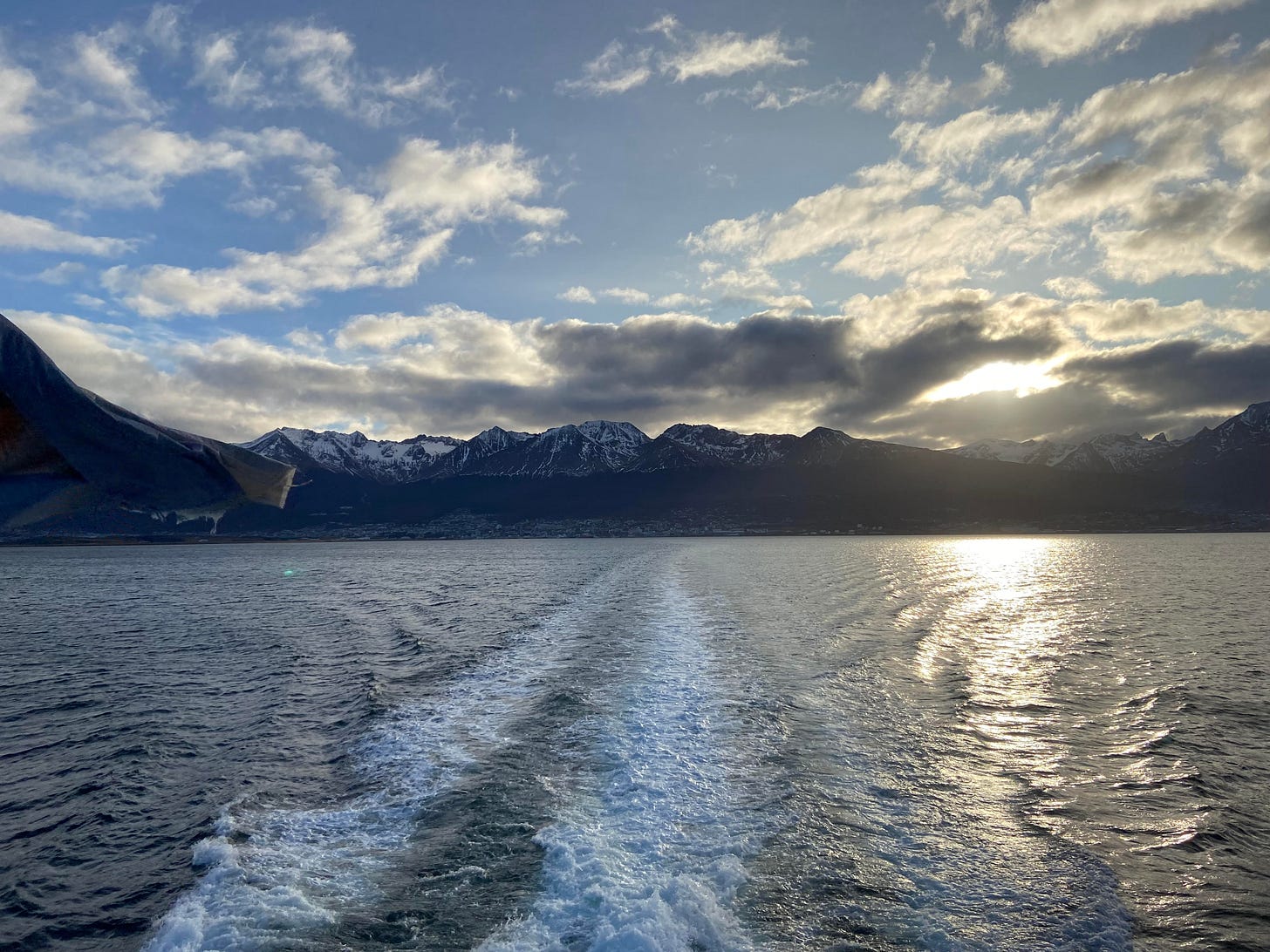 The boat departed about 3:30 pm, heading south and east. The tour was full even in the offseason; there were over 100 passengers on board. Underway, I stood on the upper deck for as long as I could bear the freezing wind. The air was crisp. The sun was low in the sky. It was already golden hour. Snowy mountains were visible in every direction as the southern extent of the Andes disappeared into the sea. We circuited a small island populated by a solitary lighthouse and hundreds of seals and penguins.[3]